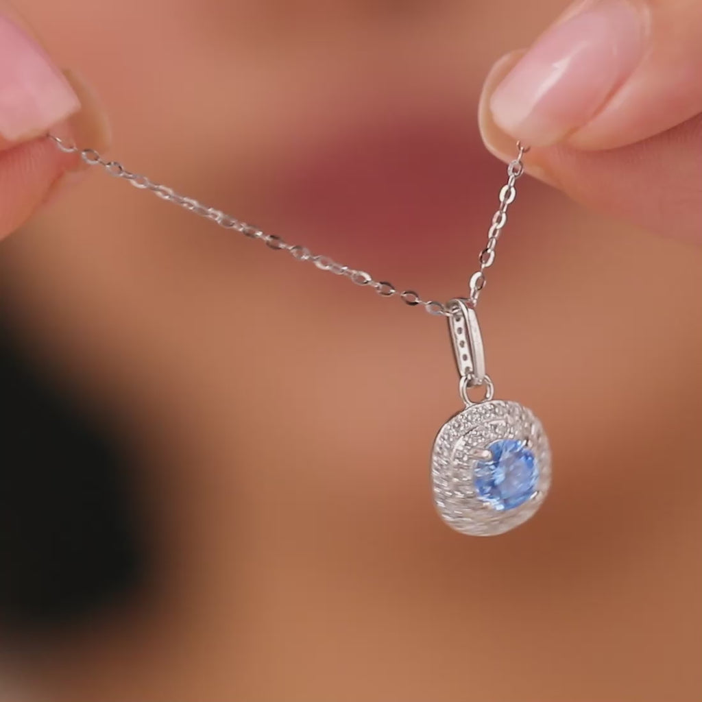 Rhodium-plated 925 silver with a solitaire halo motif set with a central blue CZ and clear CZ surround. Adjustable lobster clasp.