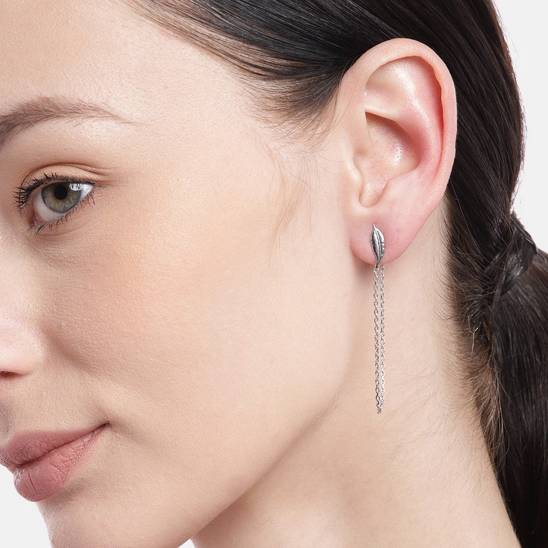 Product Description:- Add a touch of natural beauty to your look with these elegant leaf earrings. Made from high-quality 925 sterling silver and plated with rhodium for a durable, tarnish-resistant finish, these earrings feature a delicate leaf design with a chain that drapes behind the ear for added interest. The push-back closure ensures a secure and comfortable fit. Perfect for dressing up any outfit, these earrings are a must-have for nature lovers and fashionistas alike.