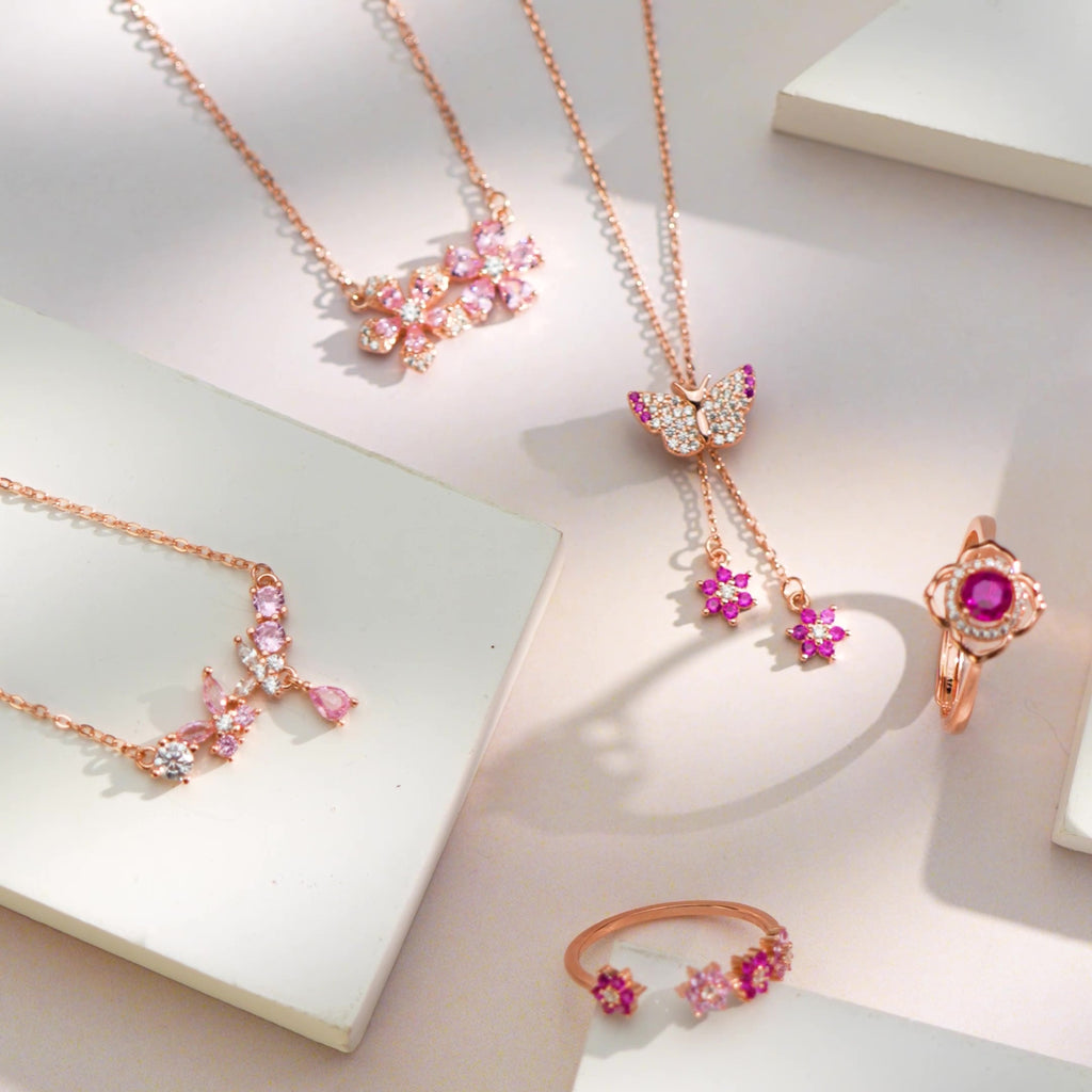 Crafted in 925 sterling silver with rose-gold plating, the necklace features floral motifs with pear and round-cut baby pink and clear CZ stones. Lightweight and adjustable, it’s a feminine piece that transitions seamlessly from day to evening.