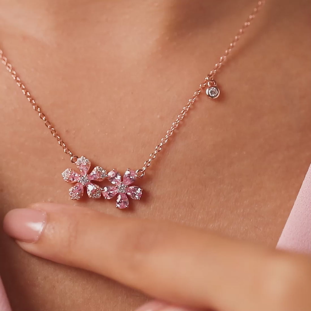 Rose-gold plated 925 silver necklace with pear-cut baby pink and clear CZ arranged in floral motifs. Adjustable with lobster clasp.