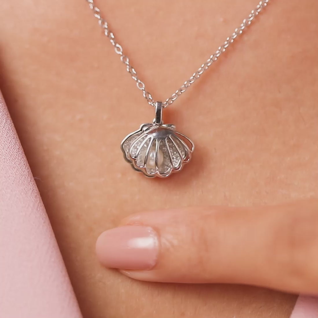 Rhodium-plated 925 silver with a pearl centerpiece framed by shell accents. Adjustable link chain with lobster clasp.