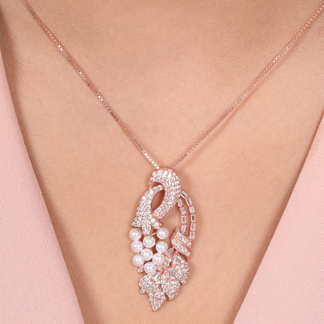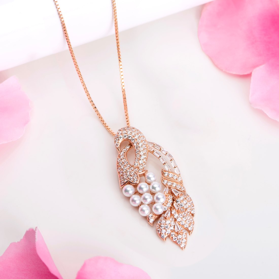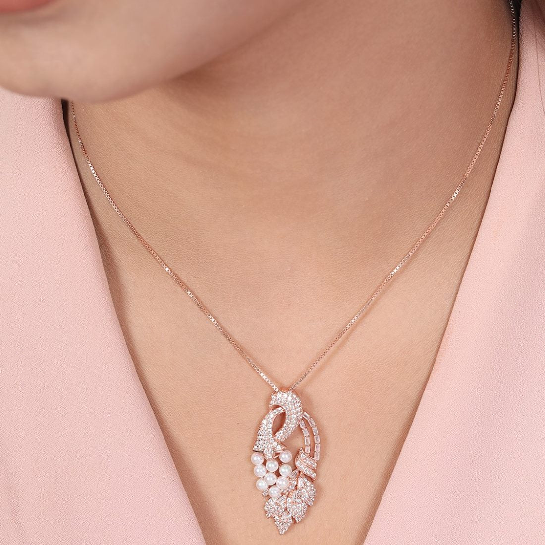 Product Description:- Unleash the beauty of nature with our Peacock Harmony Radiance Pendant. Crafted from high-quality 925 Sterling Silver and plated with the warmth of rose gold, this pendant features a stunning peacock pattern adorned with sparkling Cubic Zirconia. The result is a captivating piece that seamlessly blends sophistication with natural allure, making it the perfect choice for adding a touch of refined glamour to any neckline.