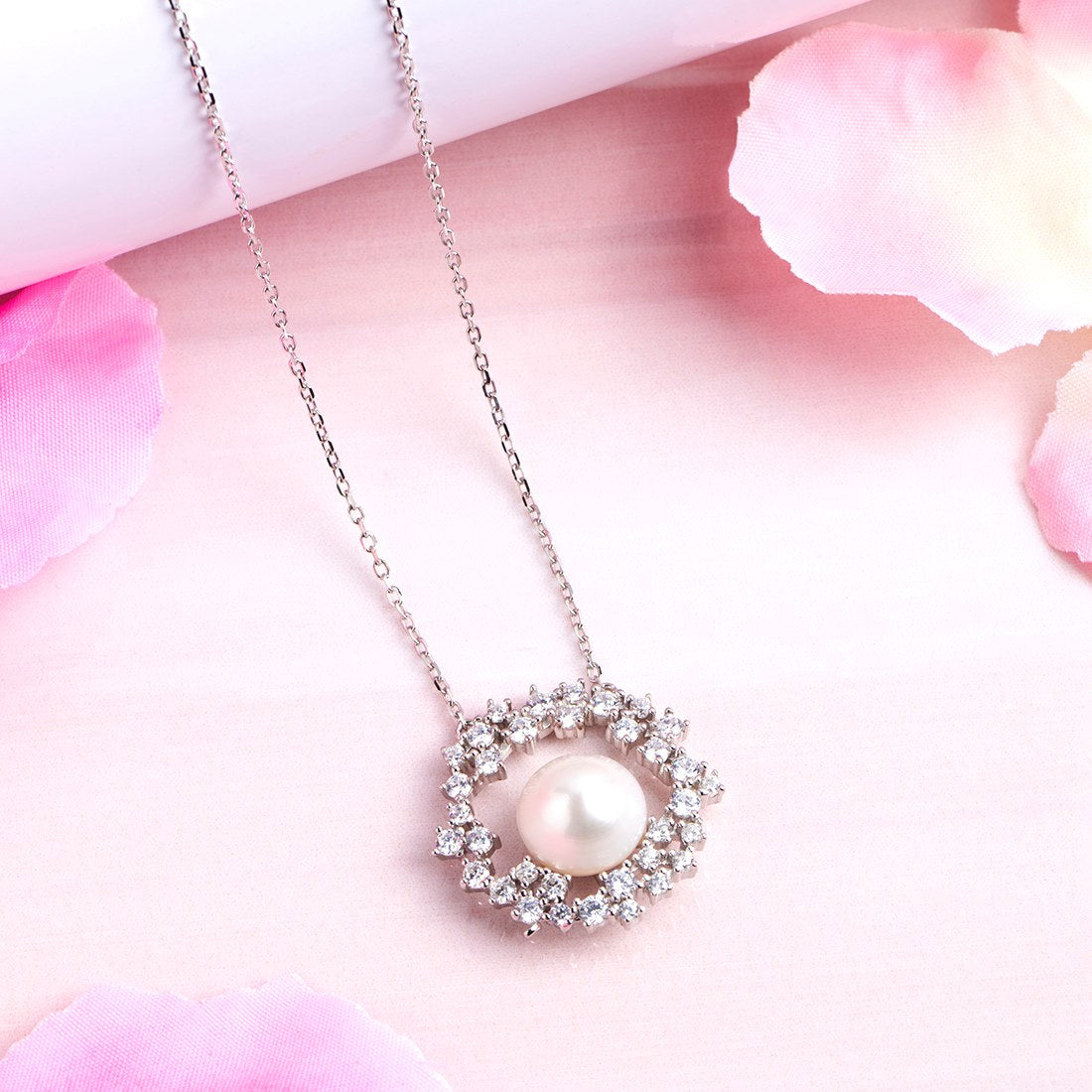 Product Description:- Adorn yourself with the timeless elegance of our Pearl Petal Radiance Necklace. Crafted from high-quality 925 Sterling Silver and plated with enduring rhodium, this necklace features a delicate flower pattern embellished with the brilliance of Cubic Zirconia and the purity of lustrous freshwater pearls. The result is a captivating piece that seamlessly blends sophistication with natural allure, making it the perfect choice for adding a touch of refined glamour to any occasion.
