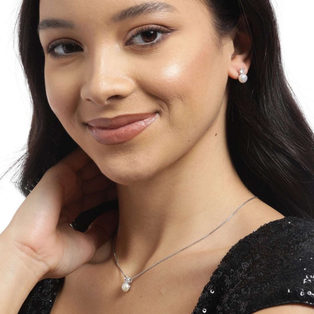 Product Description:- Drape yourself in the timeless allure of our Pearl Radiance Harmony Jewelry Set. Crafted from high-quality 925 Sterling Silver and plated with enduring rhodium, this set features the brilliance of Cubic Zirconia paired with the pure beauty of lustrous freshwater pearls. The result is a captivating ensemble that seamlessly blends sophistication with natural elegance, making it the perfect choice for adding a touch of refined glamour to any occasion.