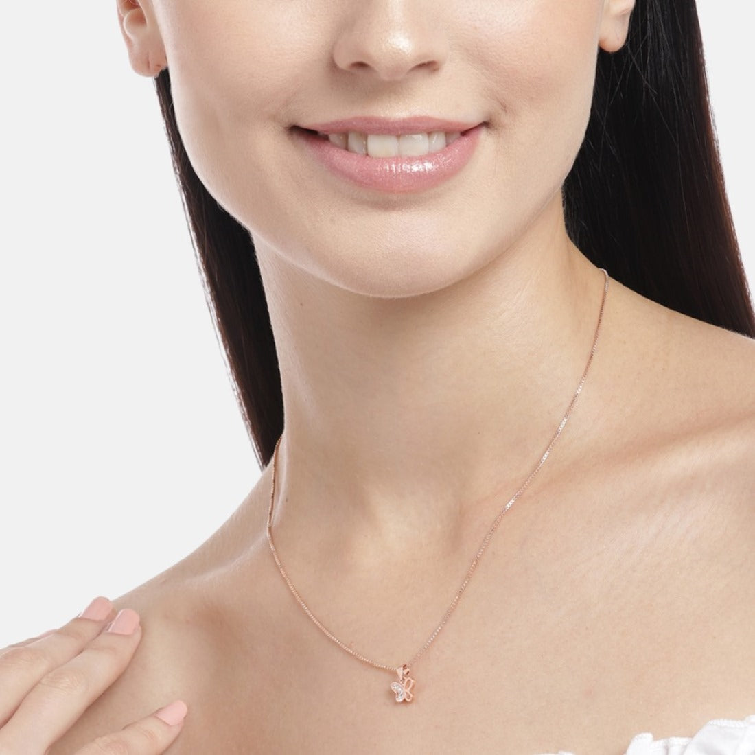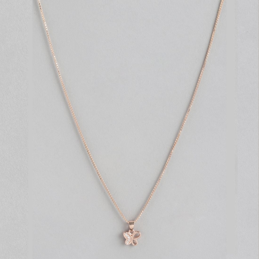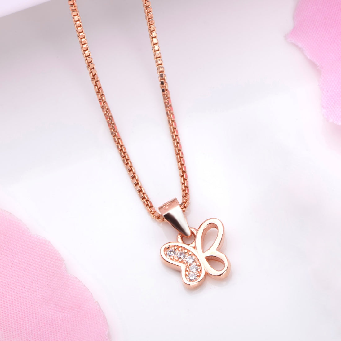 Product Description:- Embrace the delicate beauty of nature with our "Radiant Rose Gold Butterfly Whispers" pendant. Crafted from high-quality 925 sterling silver and plated with warm rose gold, this pendant features a charming butterfly pattern adorned with shimmering cubic zirconia gemstones. The intricate design captures the grace and elegance of a butterfly in flight. A symbol of transformation and freedom, this pendant exudes a sense of lightness and positivity. It's a perfect accessory to add a touch of enchantment to any outfit.