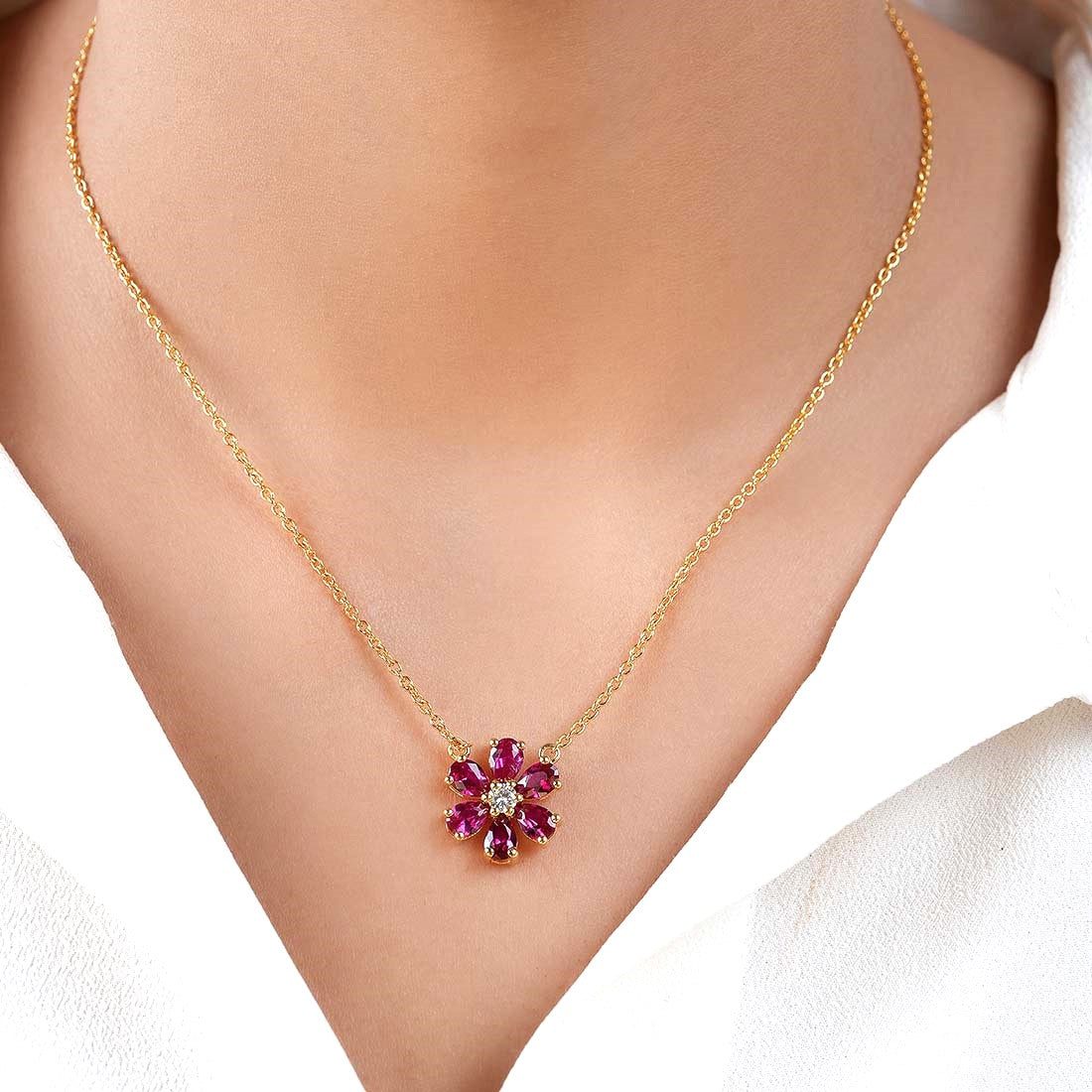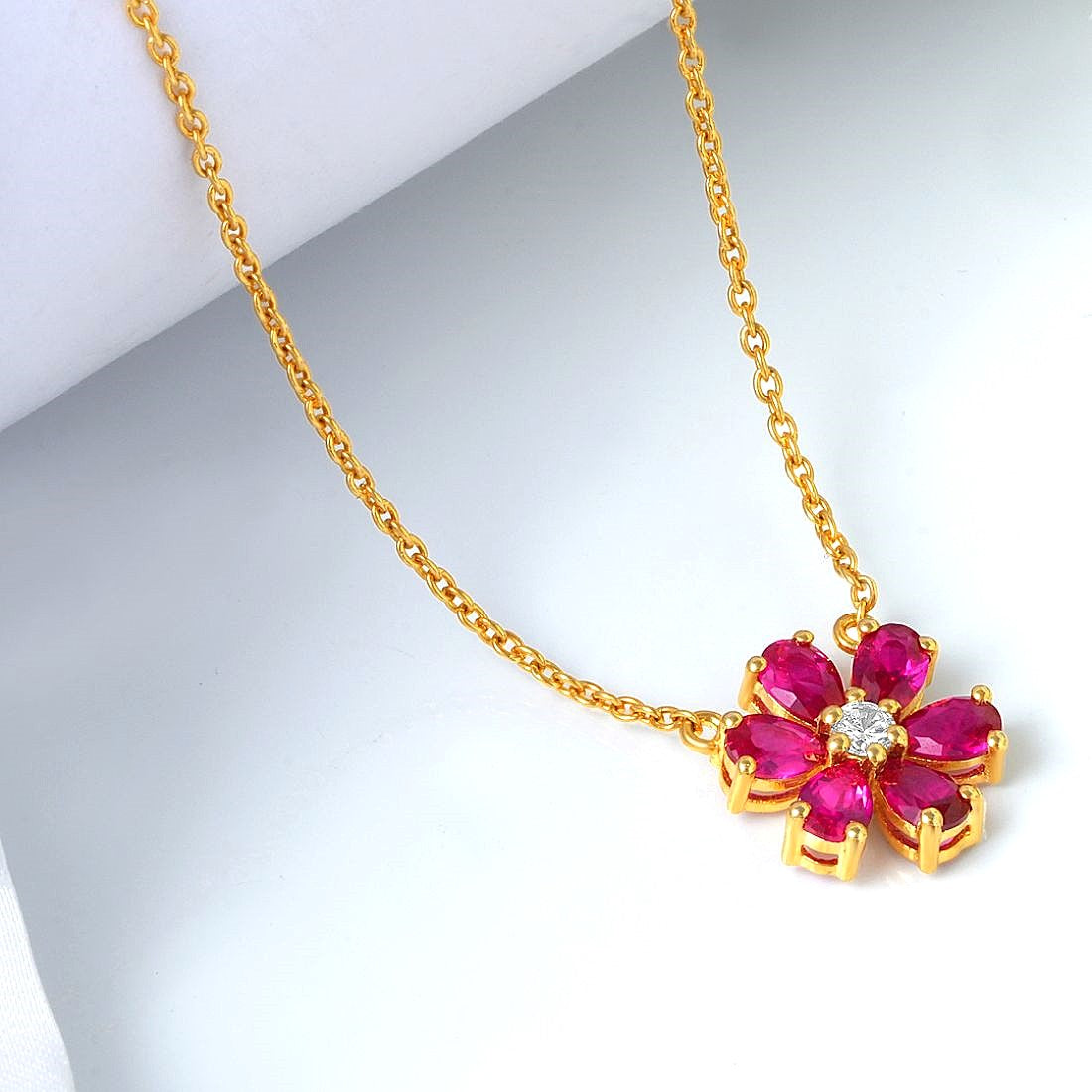 Product Description:- Crafted from high-quality 925 sterling silver with a lustrous gold plating, this necklace features a delicate pink floral design adorned with sparkling cubic zirconia stones. Inspired by the timeless beauty of flowers, it symbolizes love, grace, and elegance. Perfect for both everyday wear and special occasions, this necklace adds a touch of warmth and sophistication to any outfit, making it a cherished addition to your jewelry collection.