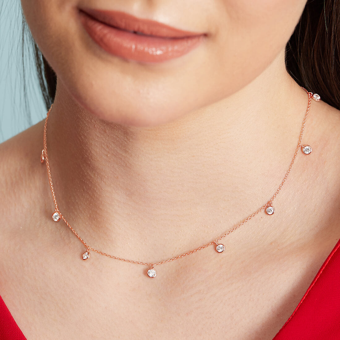 Product Description:- Made to woo the onlooker with its charm, this cutie has multiple little charms dropping from a rose gold plated sterling silver chain.