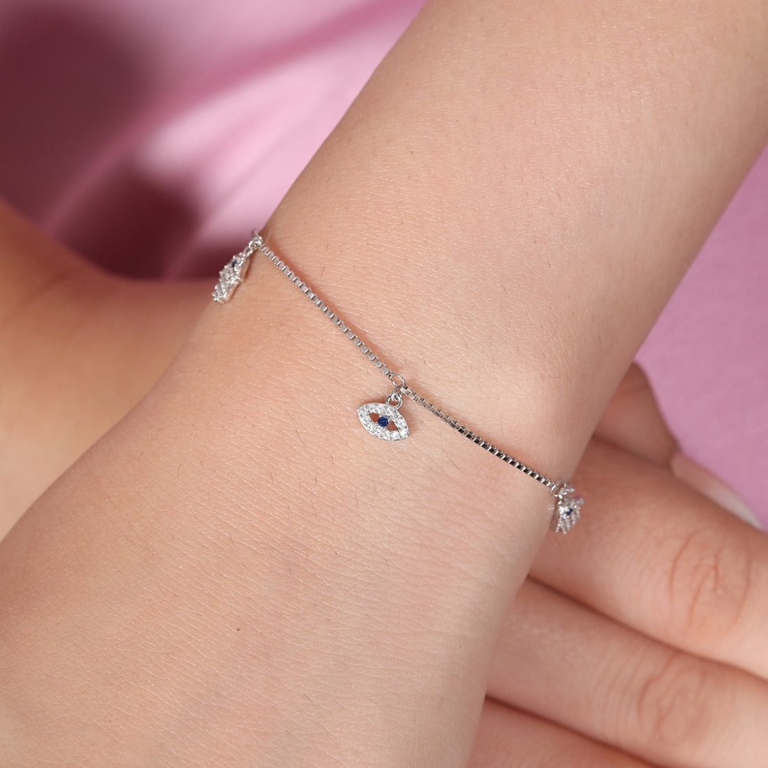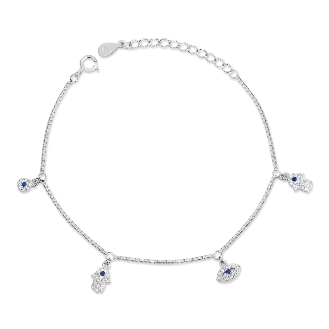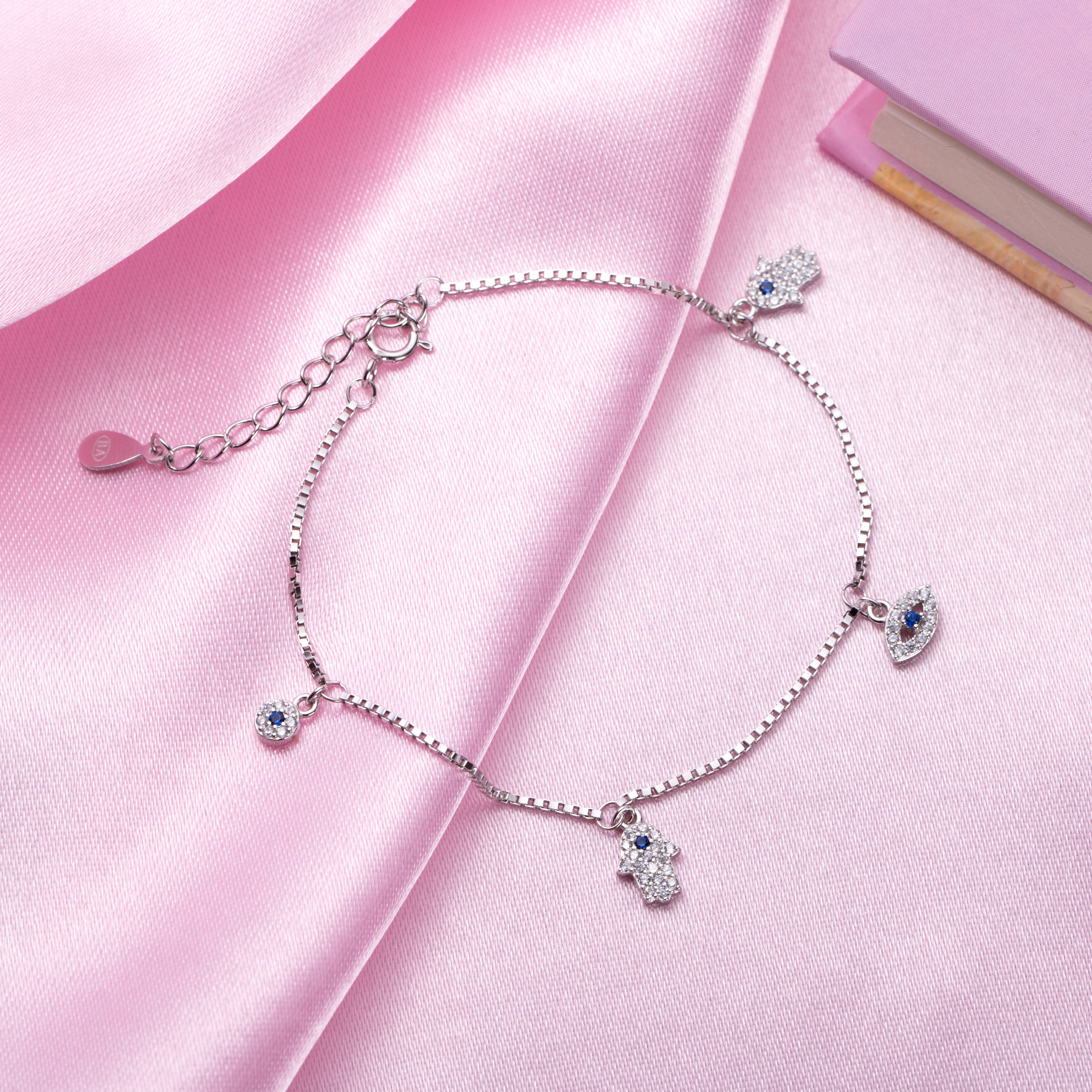 Product Description:- Embrace protective energies with our Protective Charms rhodium plated 925 sterling silver bracelet. This exquisite bracelet features a unique combination of an evil eye and palm pattern, adorned with sparkling cubic zirconia gemstones. The rhodium plating enhances the beauty and durability of the bracelet, making it a perfect accessory for daily wear or special occasions. Make a statement of spiritual strength and timeless beauty with this versatile piece that effortlessly complements your style.