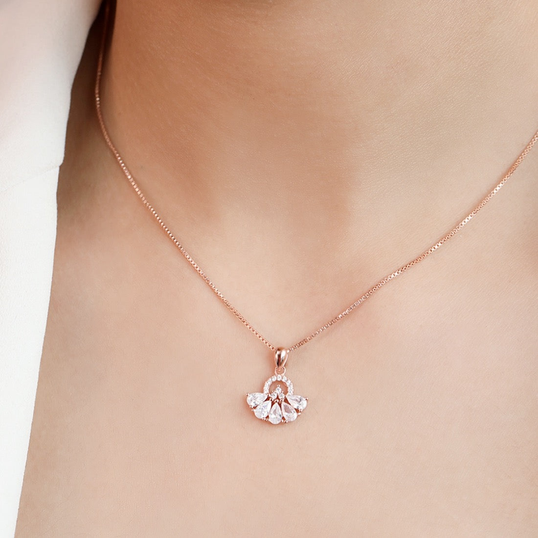 Product Description:- Embrace a world of sparkle with our Radiant Bloom pendant. This exquisite piece, crafted from 925 sterling silver and adorned with dazzling cubic zirconia, resembles a delicate flower in full bloom. The rose gold plating adds warmth and sophistication to its design. Perfect for adding a touch of glamour to any outfit, the Radiant Bloom pendant is a symbol of beauty and elegance. Wear it with pride and let its brilliance illuminate your style.