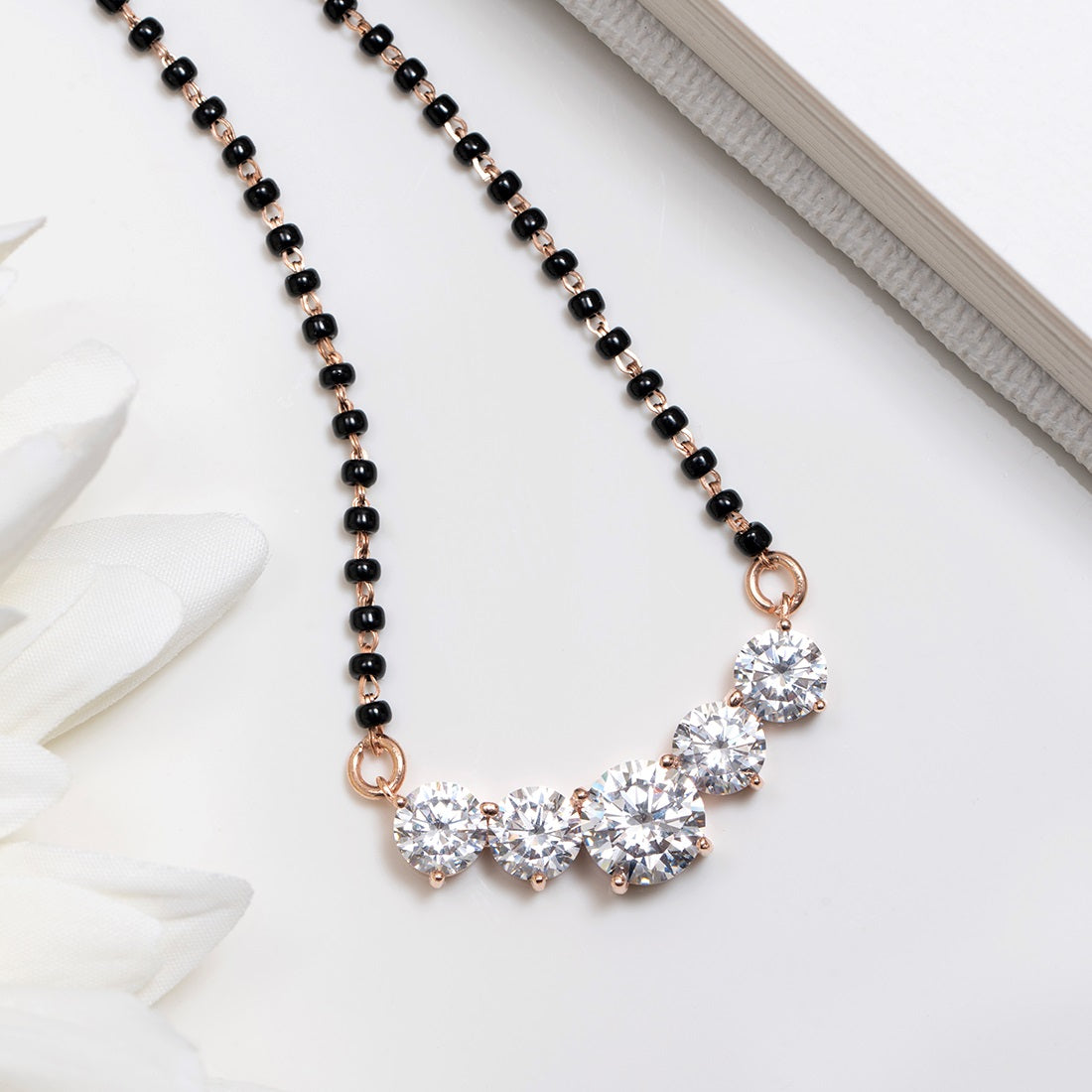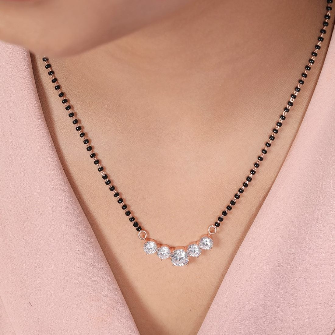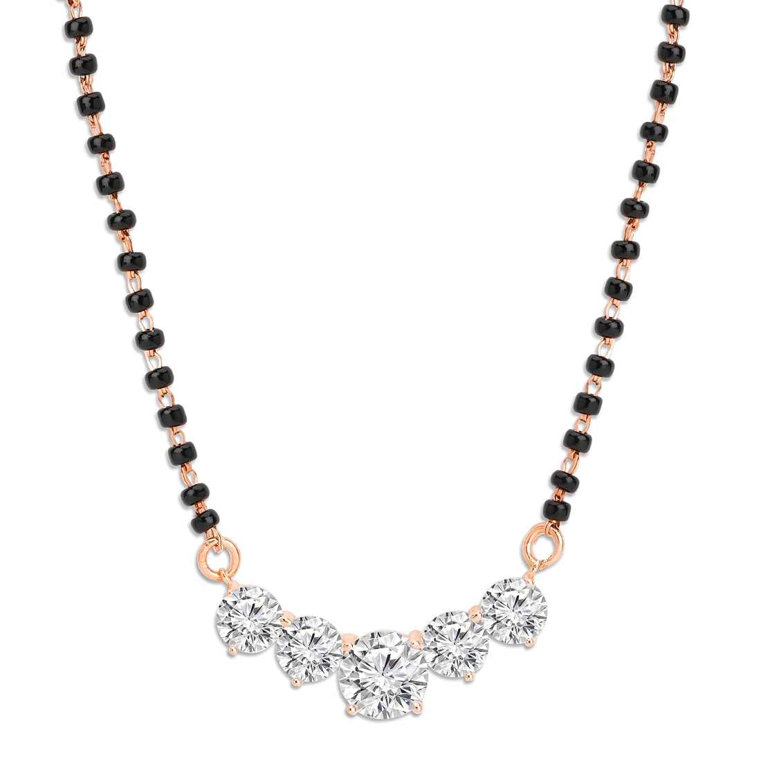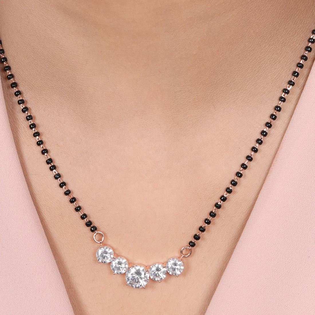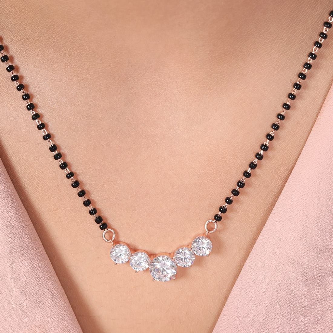 Product Description:- Add a touch of elegance to your ensemble with our radiant circle patterned mangalsutra. Crafted from high-quality 925 sterling silver and plated with luxurious rose gold, this mangalsutra features a captivating circle pattern adorned with sparkling cubic zirconia gemstones. The rose gold plating enhances its beauty with a warm and radiant glow, making it a perfect symbol of love and commitment. Elevate your traditional attire with this timeless and versatile mangalsutra that effortlessly blends sophistication and modernity.