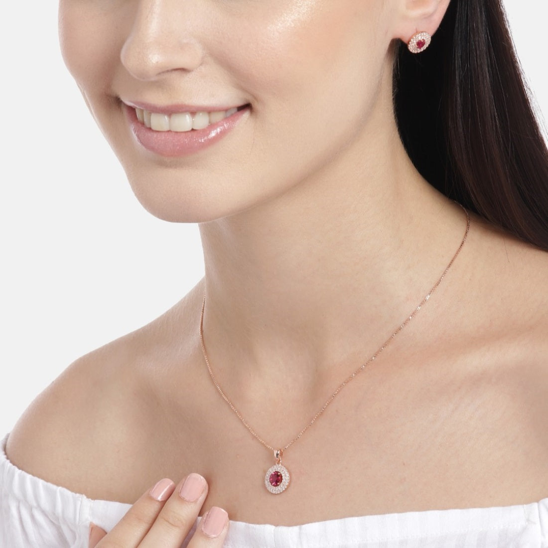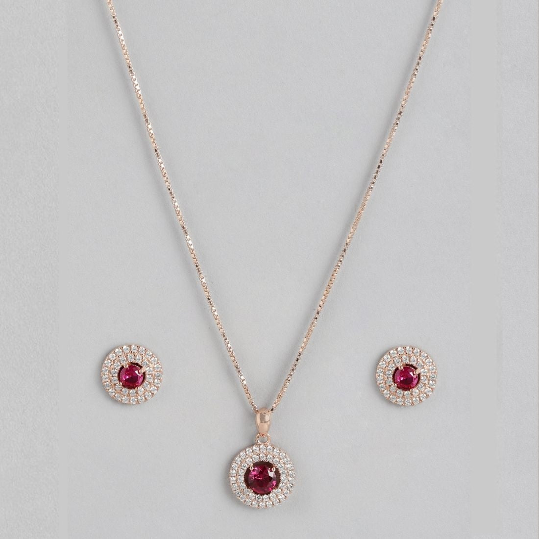 Product Description:- Enhance your elegance with the "Radiant Crimson Circles" jewelry set. This exquisite collection features lustrous rose gold-plated 925 sterling silver, adorned with stunning red cubic zirconia stones. The circular pattern adds a touch of sophistication, making it perfect for both casual and formal occasions. Elevate your style and let your beauty shine with this enchanting jewelry set.