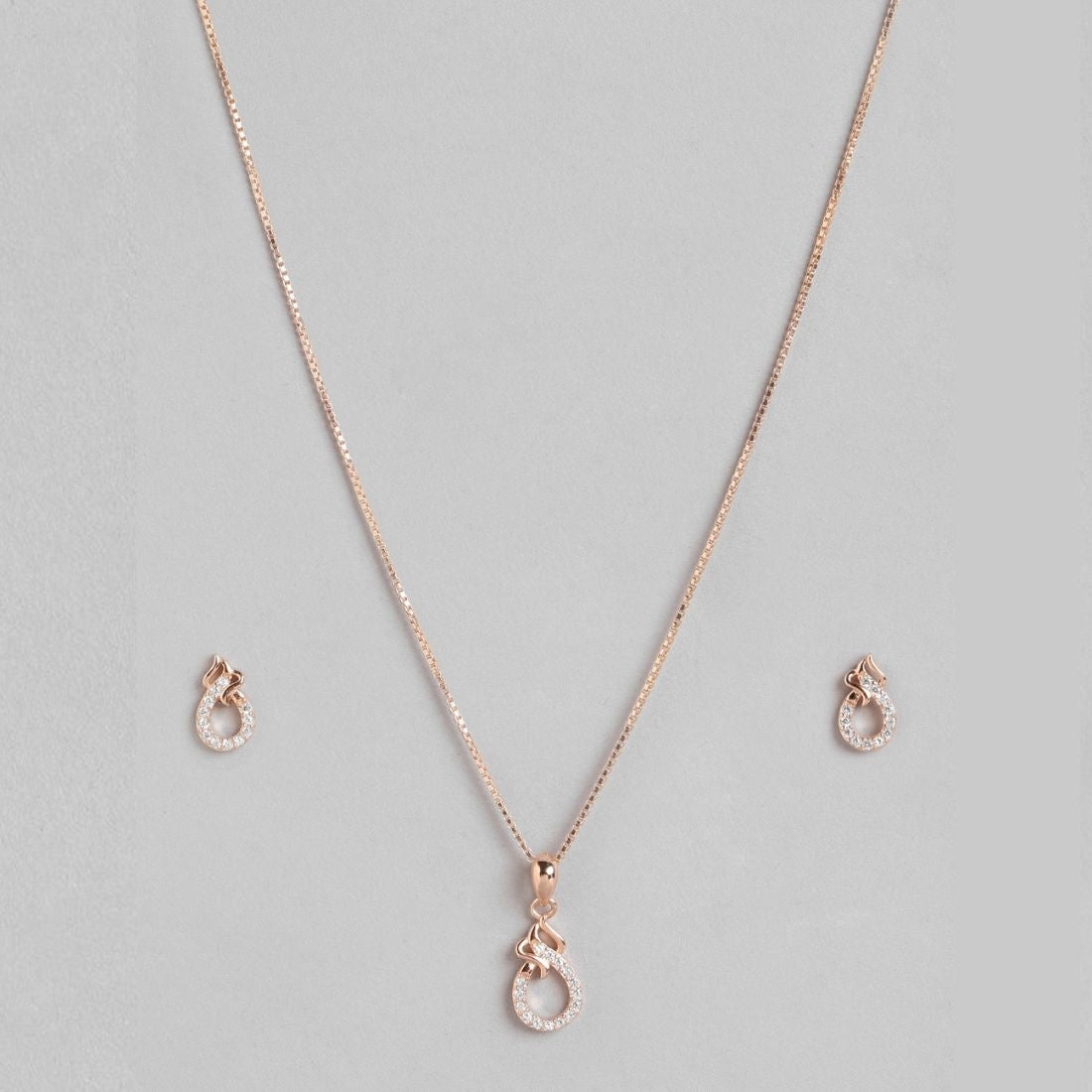 Product Description:- This exquisite jewelry set adorned with shimmering cubic zirconia stones and bathed in a luxurious rose gold plating exudes opulence and charm. The set includes a necklace, matching earrings, and an elegant bracelet, all thoughtfully designed to complement each other. Whether it's a special occasion or a night out, this set adds a touch of glamour to your ensemble. Elevate your style with this captivating rose gold-plated jewelry set, a testament to sophistication and grace.
