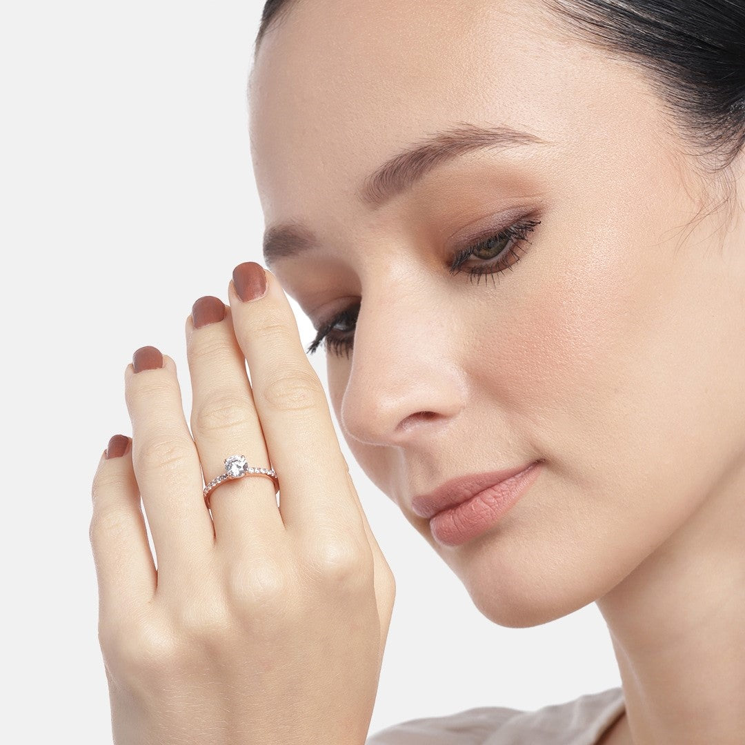 Product Description:- Elevate your style with the Radiant Roségold Gleam 925 Sterling Silver Ring. This exquisite ring showcases a captivating cubic zirconia stone in a stunning rosegold plated setting, exuding elegance and sophistication. The delicate craftsmanship and attention to detail make it a perfect accessory for any occasion. Whether it's a special celebration or a casual outing, this ring adds a touch of glamour to your ensemble. Treat yourself or your loved one with this timeless piece that promises to dazzle and delight.