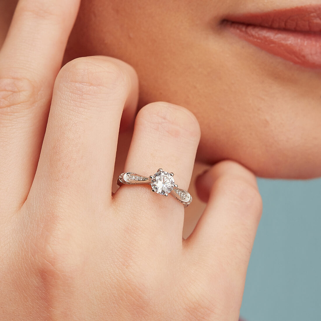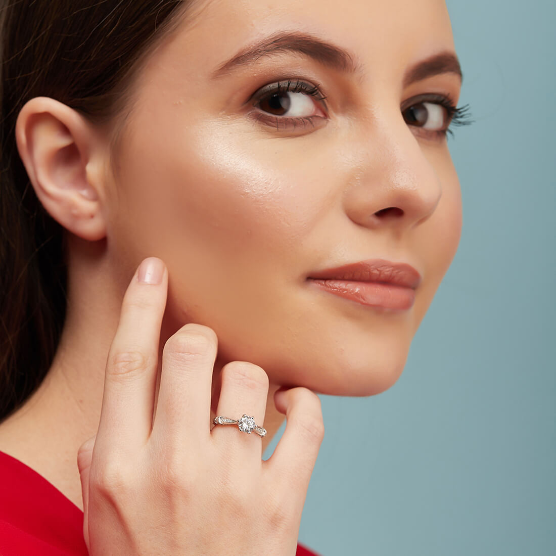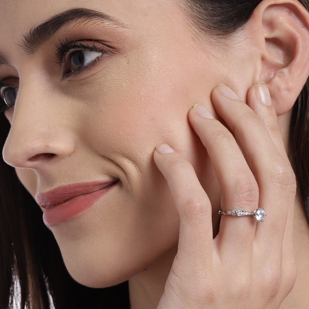 Product Description:- The ring goes as its name does. It has a premium regal look, a western touch of dazzling zircons on top on both the sides of the traditional Solitaire, blending perfectly to redefine elegance. It's indeed a perfect fit for an elegant woman like you.