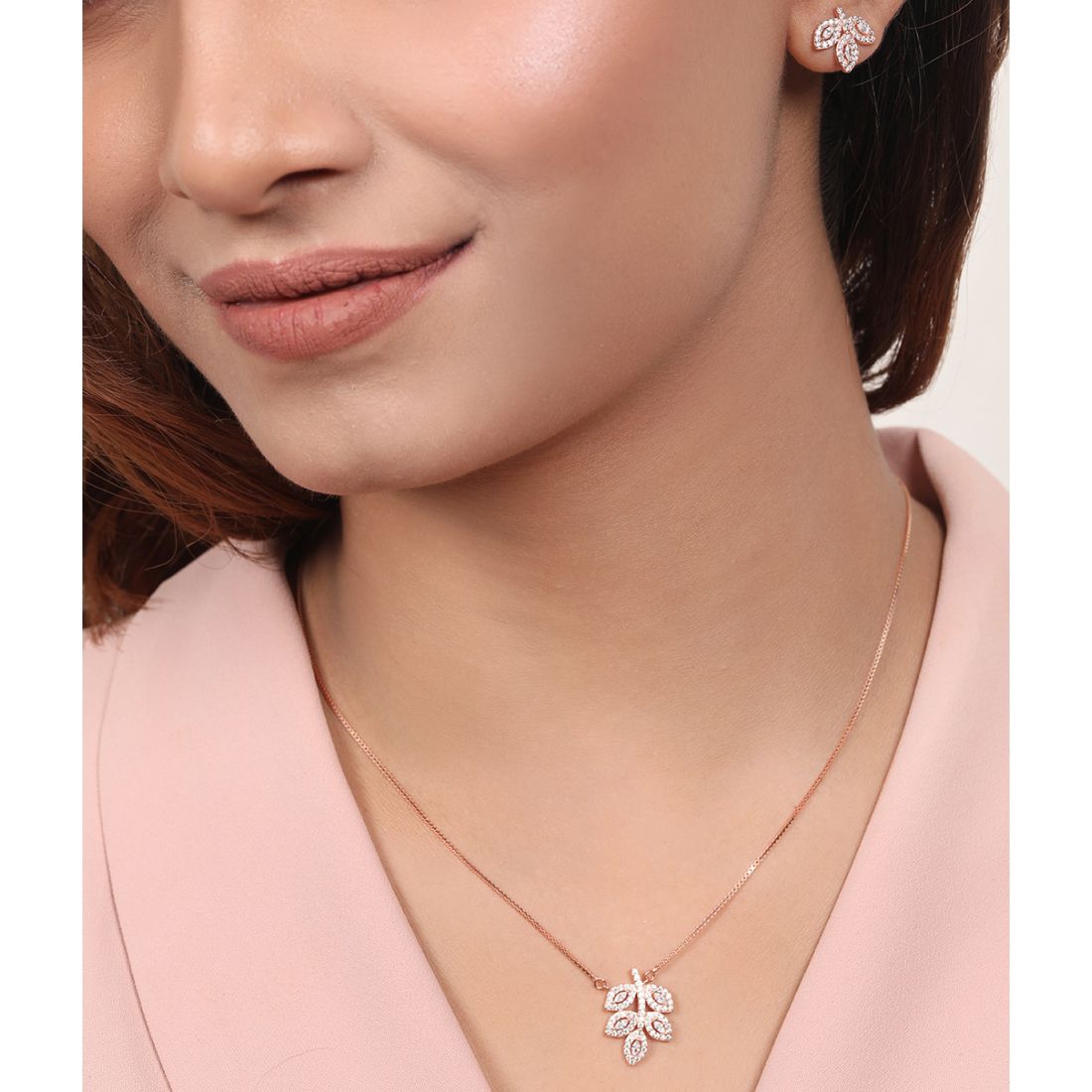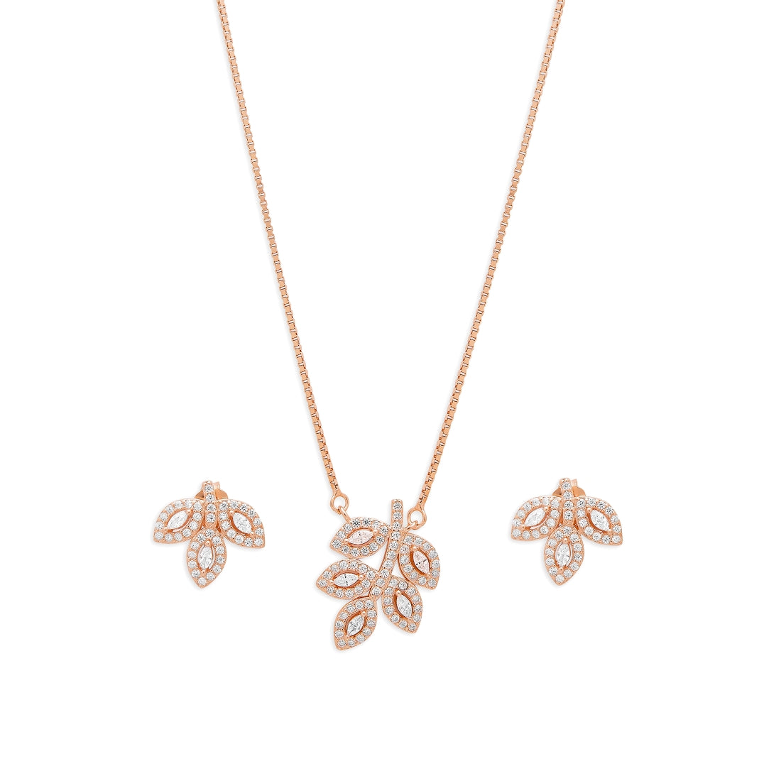 Product Description:- Embrace nature's elegance with our "Rose Gold Leaf Harmony" 925 sterling silver jewelry set, plated in radiant rose gold for a luxurious touch. This exquisite set features delicate leaf-inspired patterns adorned with sparkling cubic zirconia gemstones, exuding a sense of organic beauty and timeless sophistication. Perfect for adding a touch of botanical charm to any ensemble, each piece in this set effortlessly complements one another, creating a harmonious and stylish look that captures attention. Elevate your jewelry collection with the enchanting allure of our "Rose Gold Leaf Harmony" set, and let your style bloom with grace and refinement.