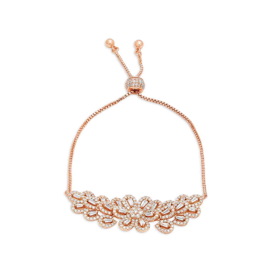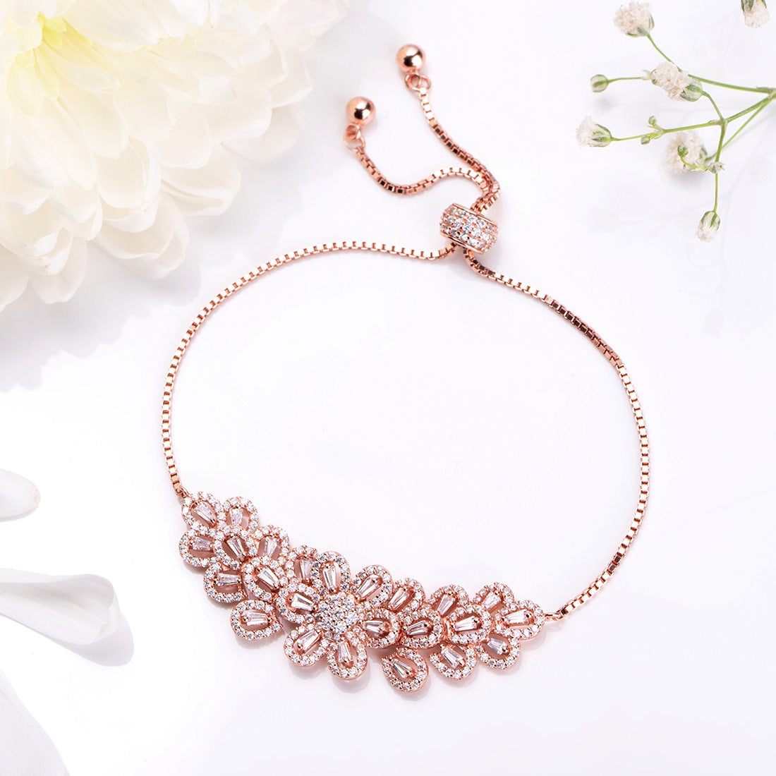 Product Description:- Introducing our 'Rose Petal Bloom' bracelet, a stunning piece crafted from high-quality 925 sterling silver and adorned with radiant rose gold plating. The intricate floral pattern adds a touch of elegance and femininity, while sparkling cubic zirconia gemstones accentuate the beauty of each petal. Elevate your look with this exquisite bracelet, perfect for adding a hint of nature-inspired charm to any ensemble.