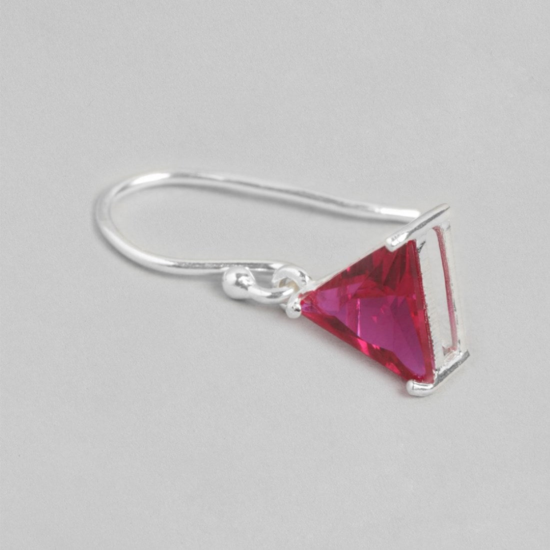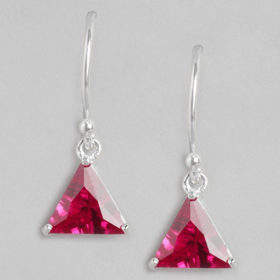 Product Description:- Experience the allure of Ruby Radiance with these exquisite earrings. The vibrant red cubic zirconia stones are set in a captivating triangle design, complemented by the lustrous rhodium-plated sterling silver. The geometric elegance of these earrings adds a touch of sophistication to any ensemble, making them a perfect choice for both casual and formal occasions. Elevate your style and let these earrings be a radiant expression of your unique taste and personality.
