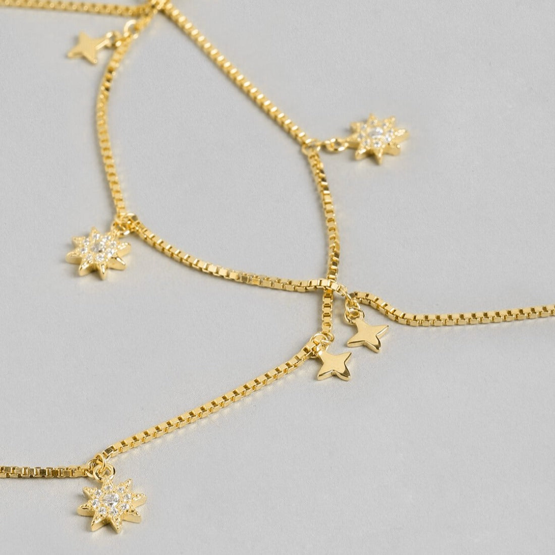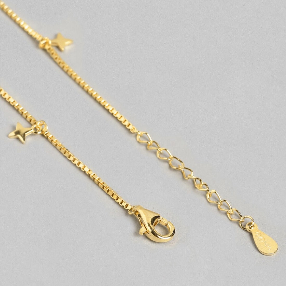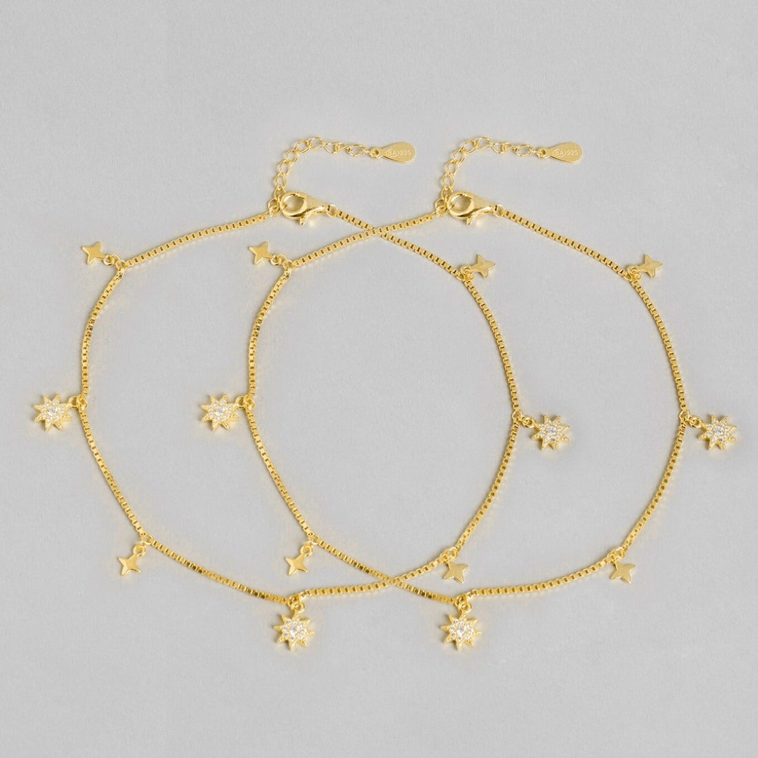 Product Description:- Step into celestial elegance with our Starry Night 925 Sterling Silver Gold-Plated Anklets. Each anklet features a mesmerizing pattern of delicate stars, meticulously crafted from high-quality sterling silver and plated with radiant gold for a luxurious finish. The adjustable design ensures a perfect fit, while the intricate detailing adds a touch of celestial charm to any ensemble. Whether worn alone for a subtle statement or layered with other accessories for a bold look, these anklets are sure to sparkle and shine with every step you take. Elevate your style and embrace the magic of the night sky with our stunning Starry Night anklets.
