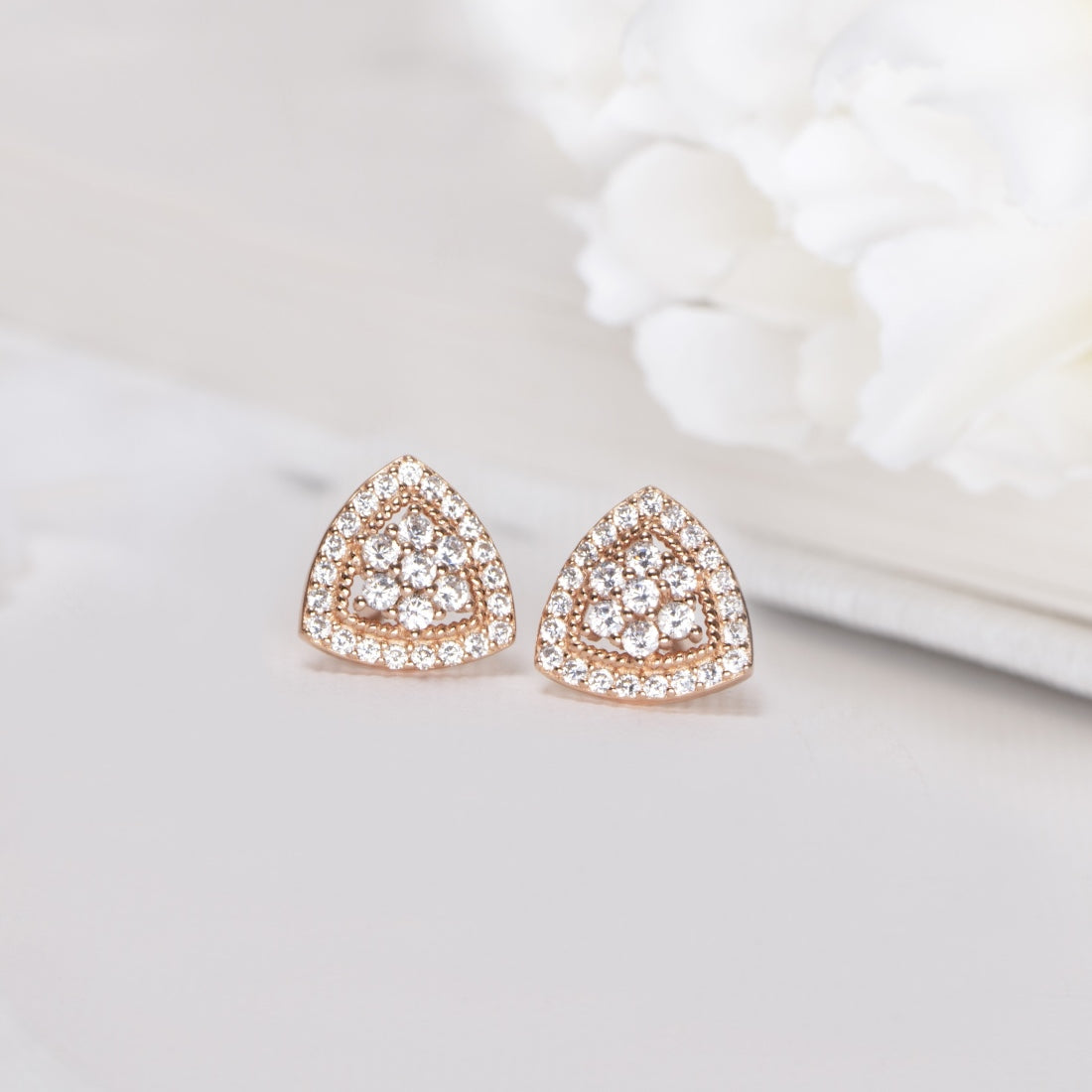 Product Description:- Unveil a garden of elegance with our Triangle Floral CZ Earrings. These exquisite earrings feature a captivating triangle-shaped design adorned with intricate floral patterns, all crafted from rose gold-plated sterling silver. The centerpieces glisten with cubic zirconia, exuding a subtle brilliance. Combining geometric shapes with delicate blossoms, these earrings are a perfect blend of modern and classic style. Elevate your look with these unique and graceful earrings that celebrate the beauty of nature and the allure of rose gold.